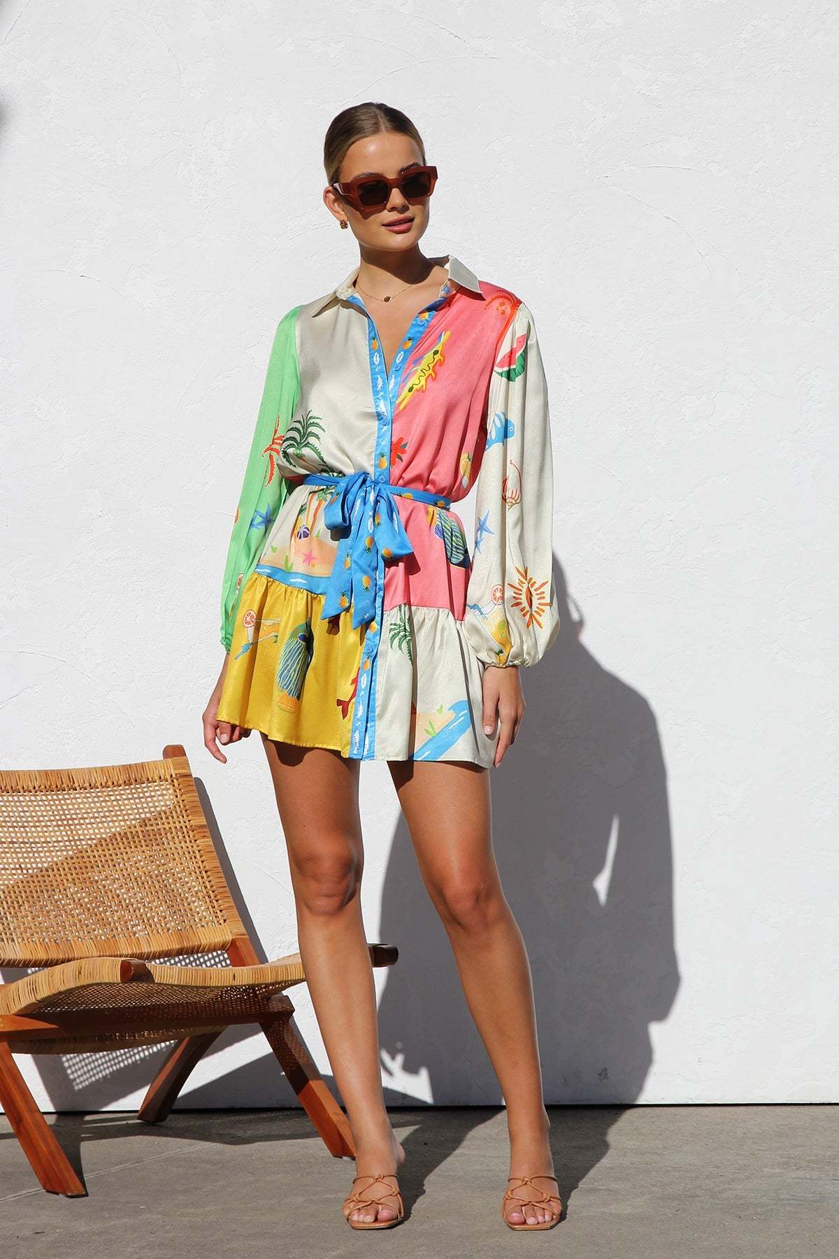 The removable fabric waist tie allows you to customize your look, creating a cinched waist for a more tailored silhouette or embracing the loose, oversized fit for a relaxed vibe. The stitch belt loops can be cut off without compromising the garment's functionality, offering flexible styling options. Made from polyester with a sheen, this unlined and semi-sheer dress offers a luxurious feel. Please refer to the fabric swatch for accurate color representation, as print placement may vary.