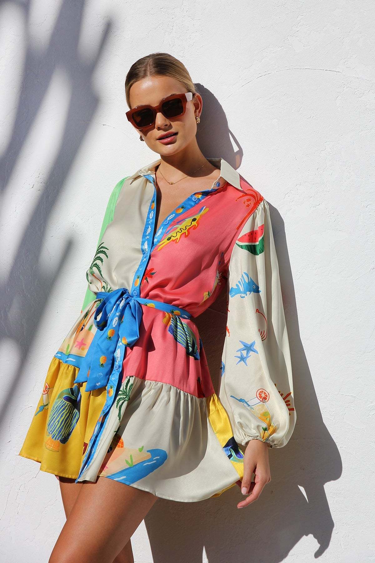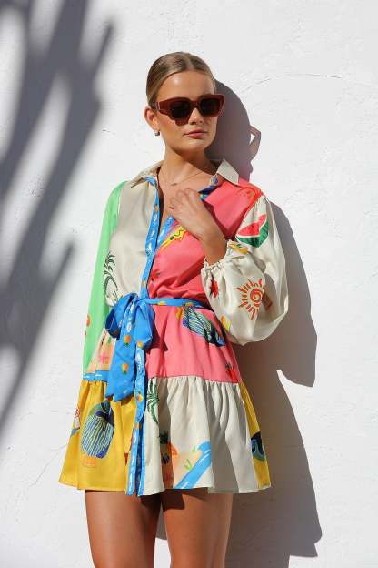Brighten up your wardrobe with this multi-colored print dress, designed for versatility and style. Featuring a classic collared neckline and a functional button-down front, this dress effortlessly combines elegance with practicality. The attached frill hem adds a playful touch, while the long sleeves with elastic cuffs enhance the dress's feminine charm.