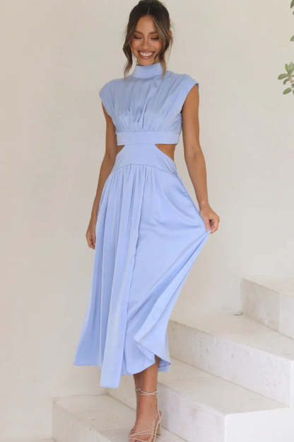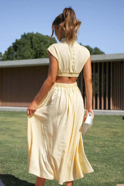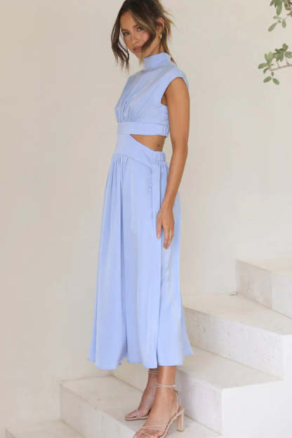 Get ready for summer adventures with our Cutout Waist Midi Dress. Crafted for comfort and style. this dress features a flattering cutout waist design and convenient pockets. Perfect for vacations. beach days. or casual outings. Elevate your warm-weather wardrobe with this chic and versatile piece.
