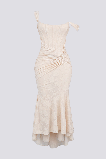 Elevate your style with our Octavie Ruched Corset Maxi Dress! This stunning dress features a flattering corset bodice and delicate ruching, creating a beautiful hourglass silhouette. The beige color is perfect for any occasion and the maxi length adds a touch of elegance. Stand out and feel confident in Octavie!