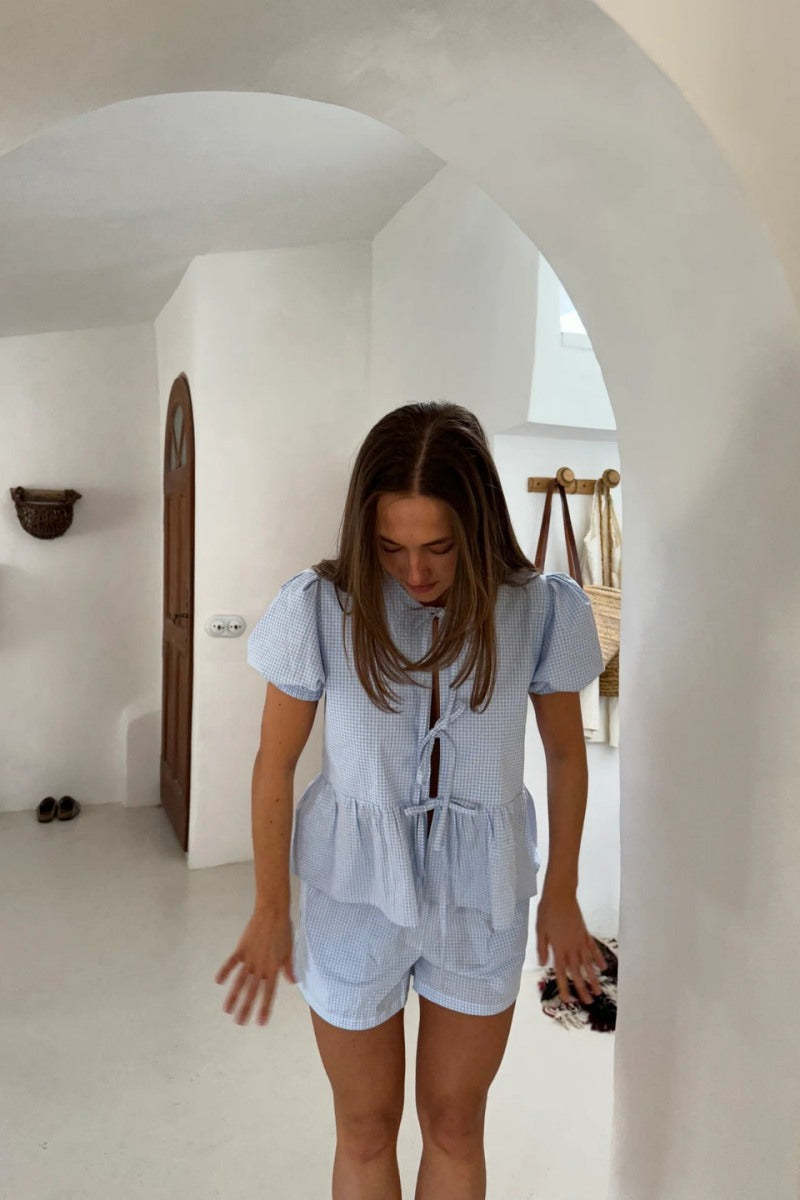 Introducing our dreamy blue pajama set, the perfect combination of nighttime comfort and style. Made from premium quality fabric with gingham pattern. Can be worn in a daytime too.