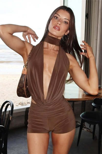 This spring-ready set features a sultry cowl neck halter top with adjustable tie straps, paired with sleek high-waisted fitted shorts. The solid color and figure-hugging cut exude effortless charm with a touch of pure seduction. Perfect for nights out, casual streetwear, or confident spring styling.