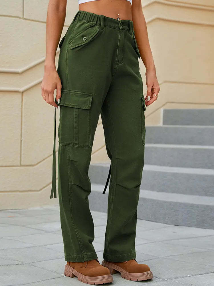 These stylish washed denim utility pants feature trendy ribbon details and a relaxed, comfortable fit. Designed for spring and summer, they combine practicality and fashion, making them an essential piece for casual and chic looks.